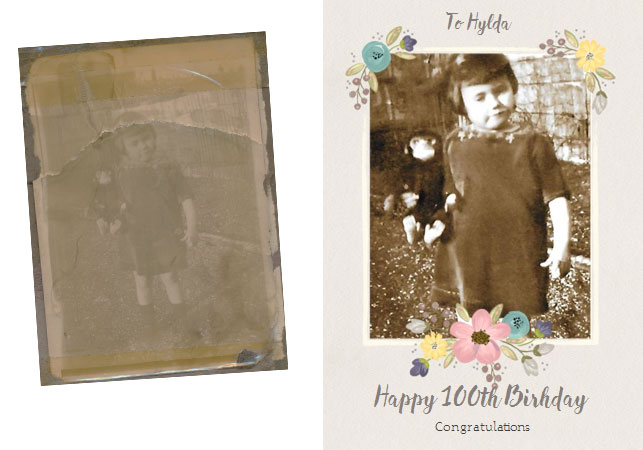 Her feelings of good will and self sacrifice lasted a day after which she spent many hours in tears for the loss of her beloved Jacko! Imagine her delight when the beautifully restored photo of Hylda and Jacko came as a special birthday card celebrating her 100th birthday…